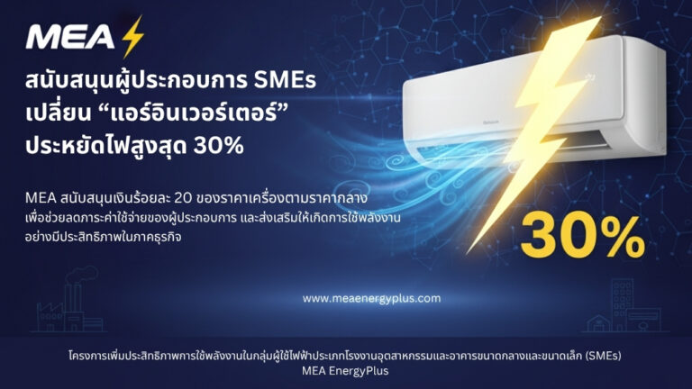 การไฟฟ้านครหลวง (MEA) เชิญผู้ประกอบการ โรงงาน อาคาร ร้านค้า โรงแรม หรือสำนักงานขนาดกลางและขนาดเล็ก (SMEs) เข้าร่วมโครงการเพิ่มประสิทธิภาพการใช้พลังงาน เพื่อรับสิทธิ์ สนับสนุนเงินสูงสุดร้อยละ 20 ของราคาเครื่องปรับอากาศแบบอินเวอร์เตอร์ (Inverter Air…