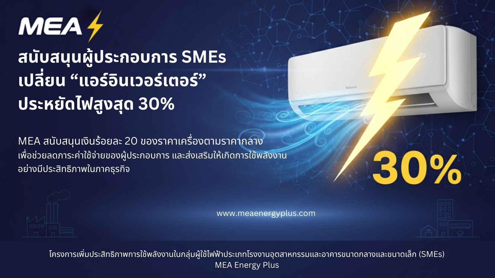 การไฟฟ้านครหลวง (MEA) เชิญผู้ประกอบการ โรงงาน อาคาร ร้านค้า โรงแรม หรือสำนักงานขนาดกลางและขนาดเล็ก (SMEs)  เข้าร่วมโครงการเพิ่มประสิทธิภาพการใช้พลังงาน เพื่อรับสิทธิ์ สนับสนุนเงินสูงสุดร้อยละ 20 ของราคาเครื่องปรับอากาศแบบอินเวอร์เตอร์ (Inverter Air Conditioner)