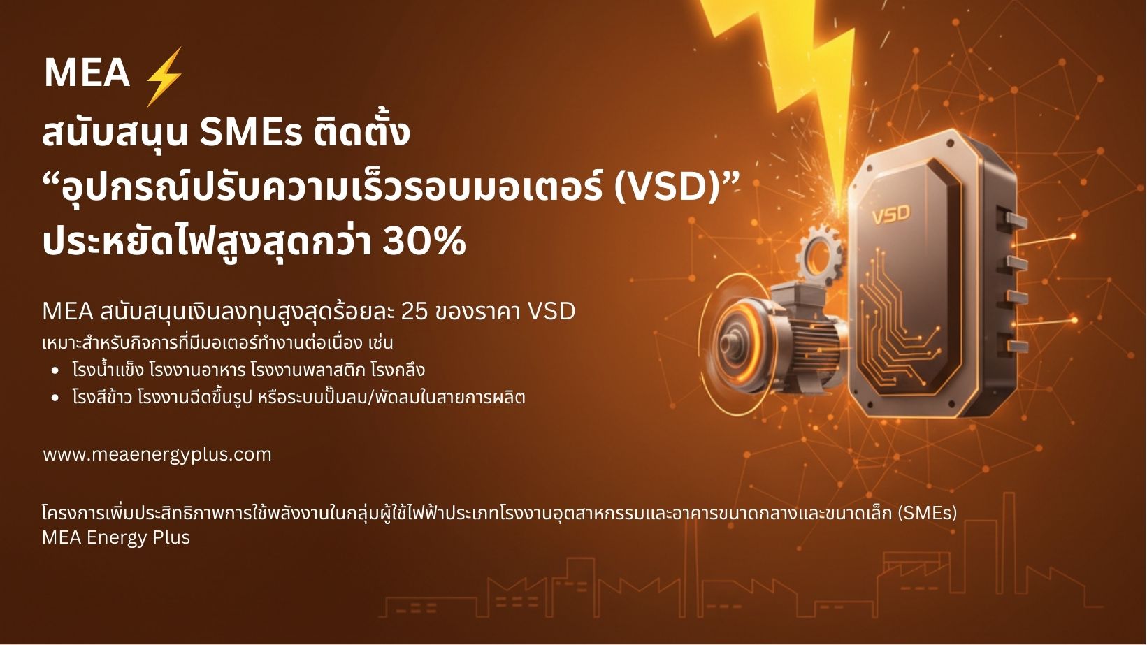 การไฟฟ้านครหลวง (MEA) เชิญผู้ประกอบการ SMEs ในพื้นที่ กรุงเทพมหานคร นนทบุรี และสมุทรปราการ เข้าร่วมโครงการเพิ่มประสิทธิภาพการใช้พลังงาน เพื่อรับสิทธิ์ สนับสนุนเงินลงทุนสูงสุด ร้อยละ 25 ของราคาอุปกรณ์ปรับความเร็วรอบมอเตอร์ (Variable Speed Drive: VSD)